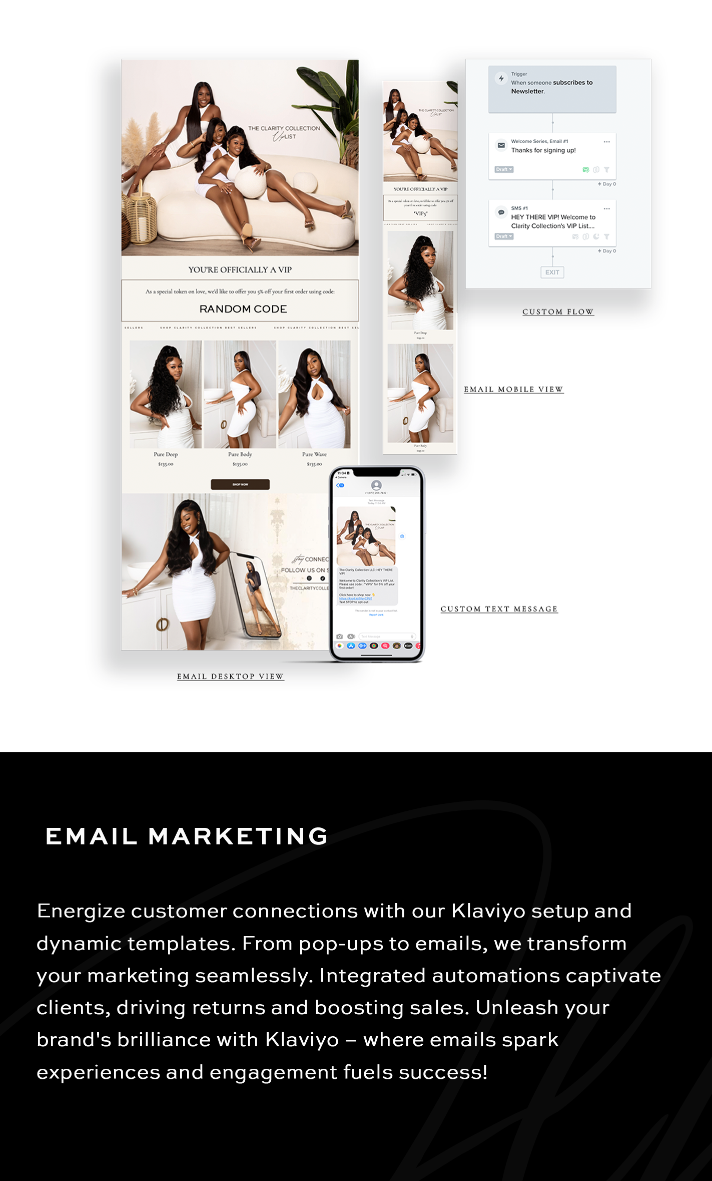 Full Price: $400Deposit Option: $100 (recommended) THIS SERVICE INCLUDES: Setup and Design of 2 automated emails/triggers (can also be applied for text messages) 1 Mobile and 1 Desktop Klaviyo Popup...
