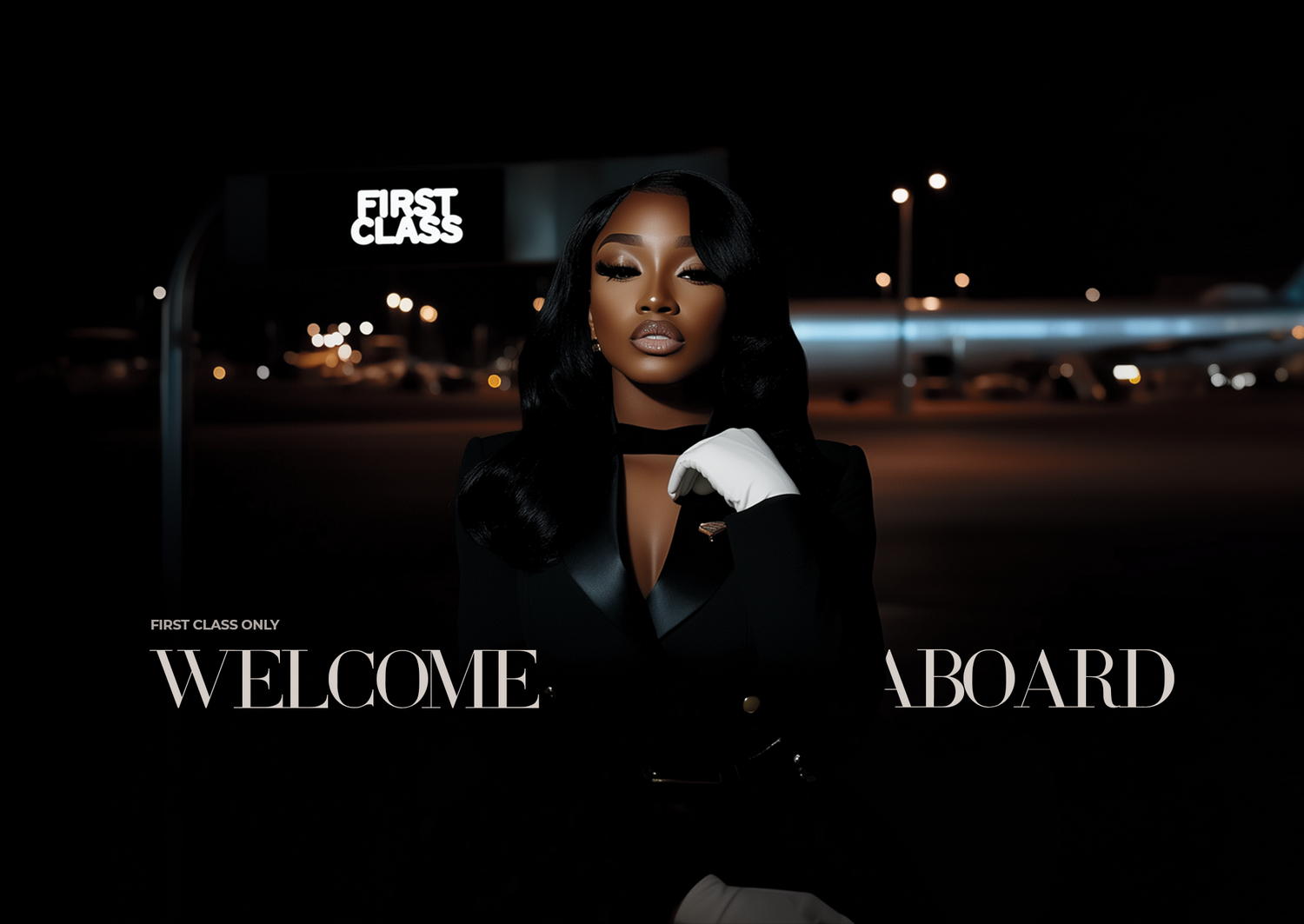 All imagery for First Class Hair was generated using AI and styled exclusively for the brand. Visuals were created within airport-inspired environments and enhanced with cinematic lighting to mirror the feeling of luxury travel. Wardrobe styling, including pilot-inspired uniforms, gloves, and branded name tags, was intentionally incorporated to transform the website into a fully realized brand world rather than a traditional e-commerce layout.